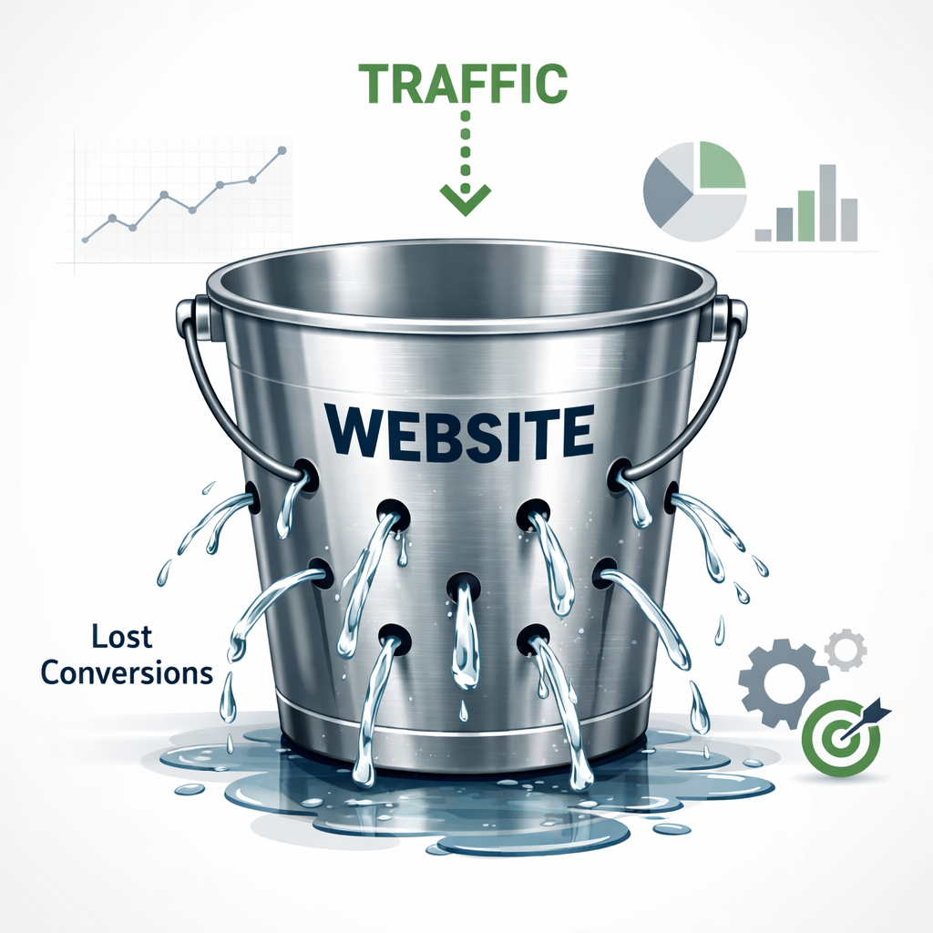 Seeing analytics numbers go up but revenue stay flat is frustrating. Many business owners assume they need more traffic, but traffic doesn’t fix a broken conversion system. It magnifies the problem. Think of traffic as water. Your website is the bucket. If the bucket has holes, adding more water only drains faster.