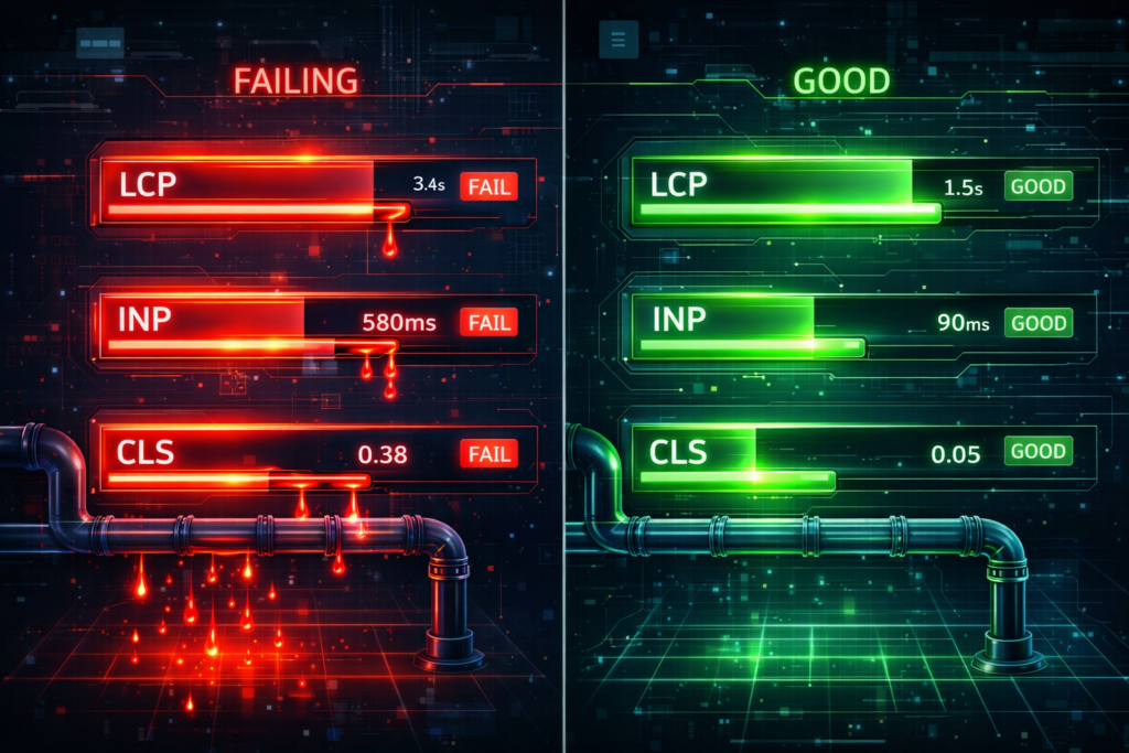 • INP (Interaction to Next Paint) — This replaced FID and is now the most important interaction metric. It measures how fast the page responds when a user taps, clicks, or types. If a button visually reacts late, users feel the site is broken.