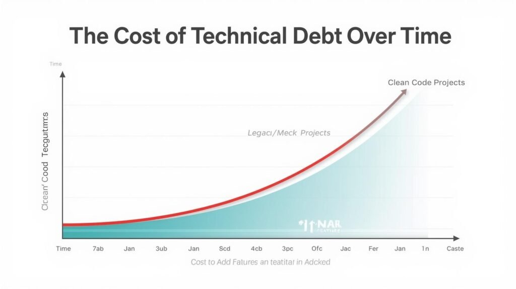 The most significant financial reason to prioritize clean code is to avoid “Technical Debt.” In software development, technical debt is a metaphor for the extra work that arises when you choose an easy (messy) solution now instead of a better approach that takes slightly longer.